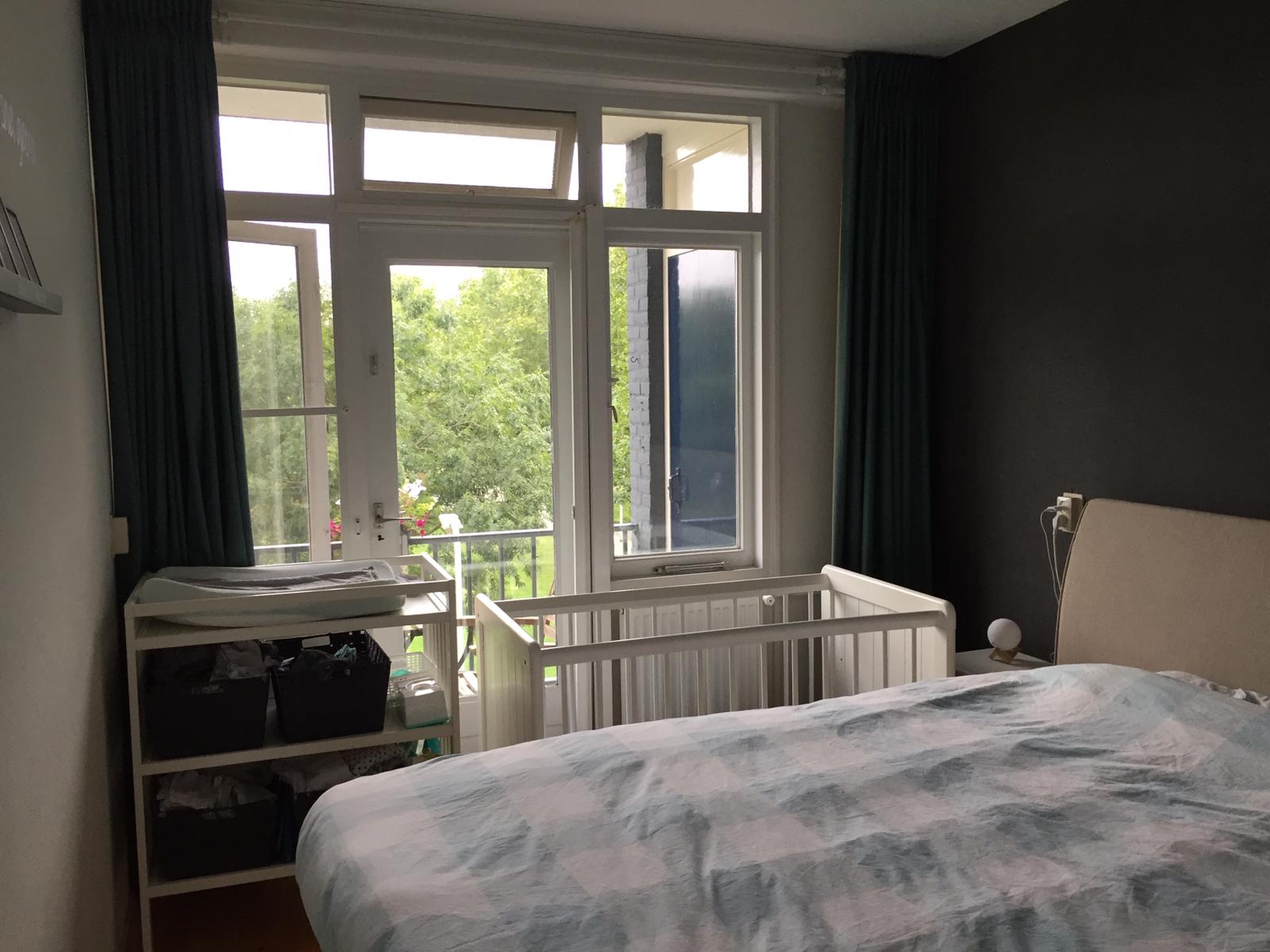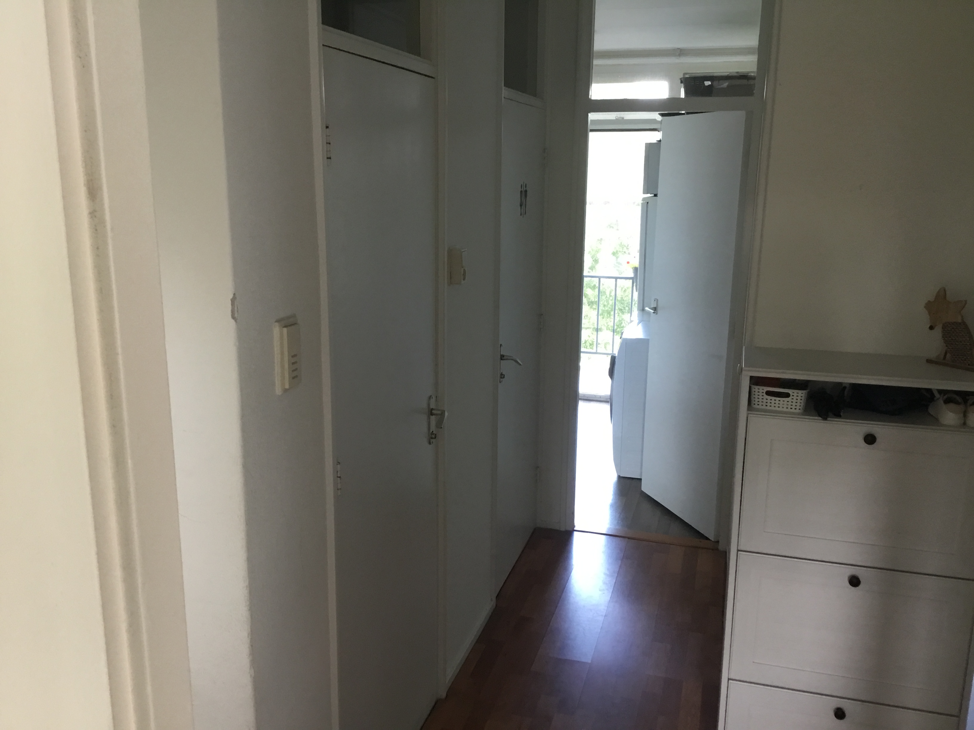 Entree. Hal met toegang tot de diverse ruimtes. De L-vormige woonkamer is vergroot door het bijtrekken van een slaapkamer, heeft veel lichtinval en is o.a. voorzien van een kersen laminaatvloer, strak gestuukte wanden, een Frans balkon en een screen. Aansluitend ligt de hoofdslaapkamer met parketvloer, stucwerk wanden en toegang tot het balkon aan de achterzijde.